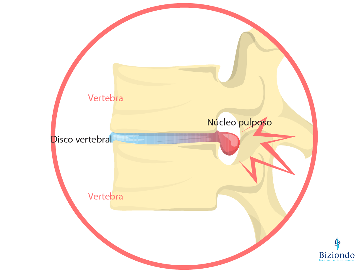 Entre cada vértebra se encuentra un disco intervertebral que sirve de amortiguador y proporciona flexibilidad a la columna vertebral. Cada disco está compuesto de dos partes: una central o núcleo pulposo y otra periférica o anillo fibroso. El anillo fibroso sirve de envoltorio del núcleo pulposo y ayuda a mantenerlo en su lugar.
