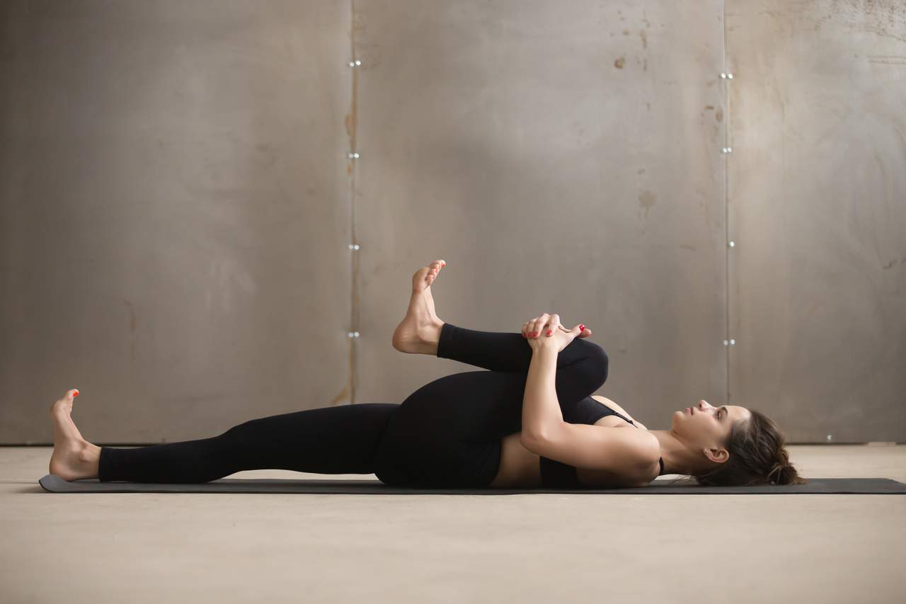 Acuéstese boca arriba y lleve una rodilla al pecho mientras mantiene la otra pierna recta y apoyada en el suelo. Presiónelo contra su pecho, empujándolo hacia abajo lo más que pueda y mantenga la posición durante 30 segundos. Asegúrese de que sus hombros estén firmemente plantados en el suelo.